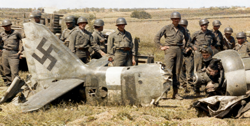 In einem Forum fand ich durch die Vorrecherche von Mark Haldimann eine interessante Aufnahme, die aber auch unsicher ist, es konnte eine Orthochromatische Aufnahme sein, so dass es sich dann um eine II./JG2 Maschine handelt, wenn nicht, dann mit hoher Wahrscheinlichkeit doch JG300. Amerikanische Soldaten stehen hier - anscheinend in Bayern (Augsburg?) - vor dem Wrack der D-9, II./ JG300.