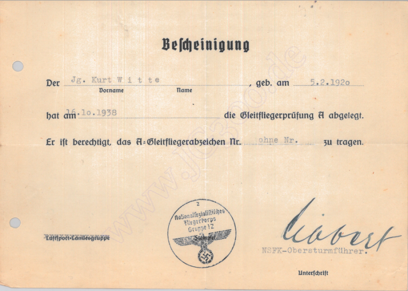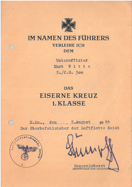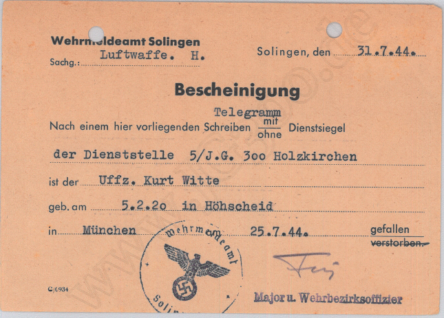 | 18.07.44 | Uffz. Kurt Witte | 5./JG 300 | B-17 | westl. Kempten: 7.500 m | 10.50 | Anerk: Nr.27 |
